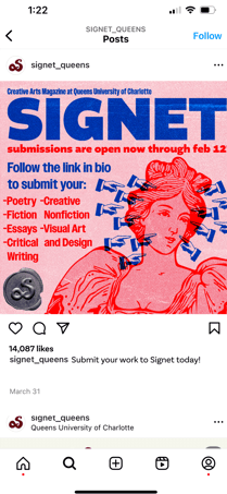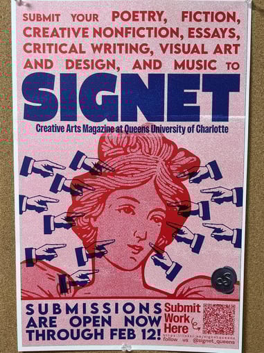 For Queens University of Charlotte's Signet Creative Arts magazine, I designed a poster and social media square to encourage student submissions. Additionally, I took on the responsibility of the magazine's book layout, using InDesign to create a visually cohesive and engaging design. I worked closely with printers to ensure the final product met the university's high standards. This project allowed me to blend creativity with attention to detail, bringing the magazine’s artistic vision to life from concept to print.